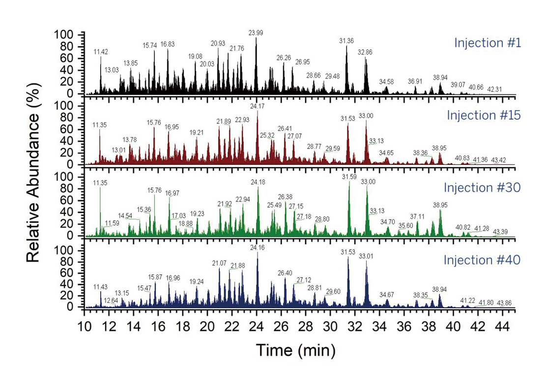 チップAを使用し、200 ngのE. coli消化物を用いた40回の連続LC-MSランを実施しました。15個のE. coliペプチドのピーク保持時間の平均RSDは0.30%です。