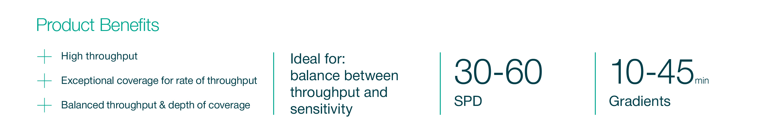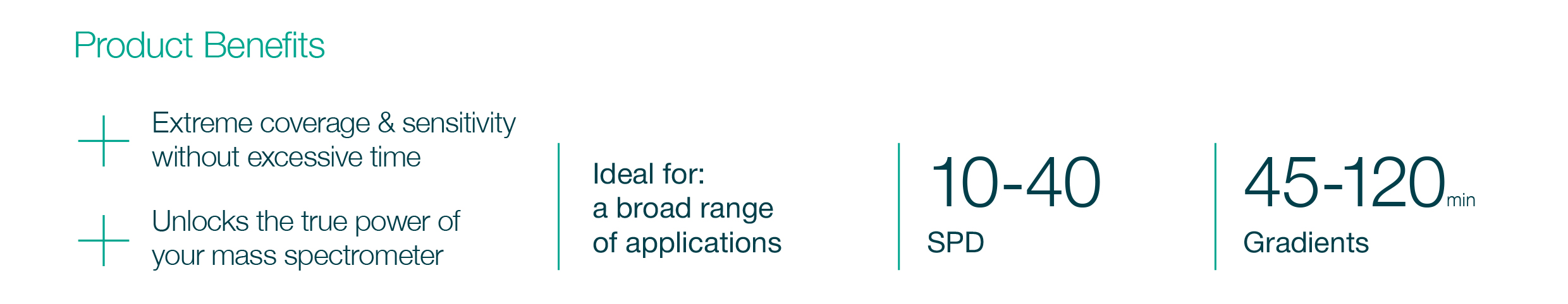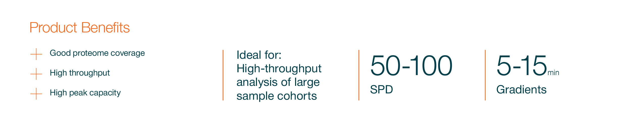 RAPID75はシングルセルプロテオミクスなど超微量サンプルでナノフローによるハイスループット分析を可能にします。短いグラジエントを使用し非常に高い感度を実現。