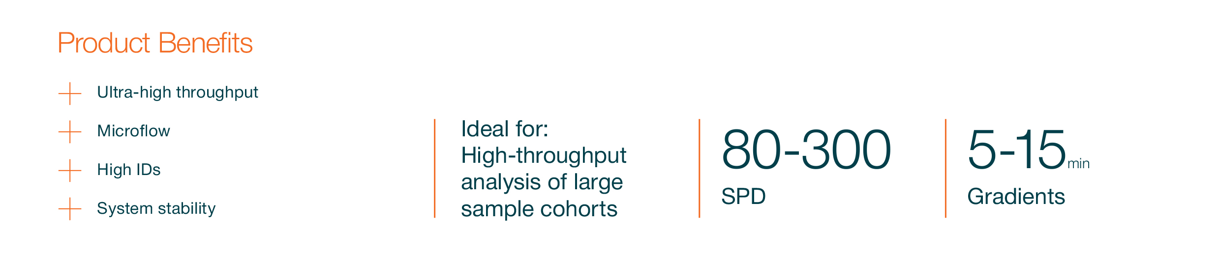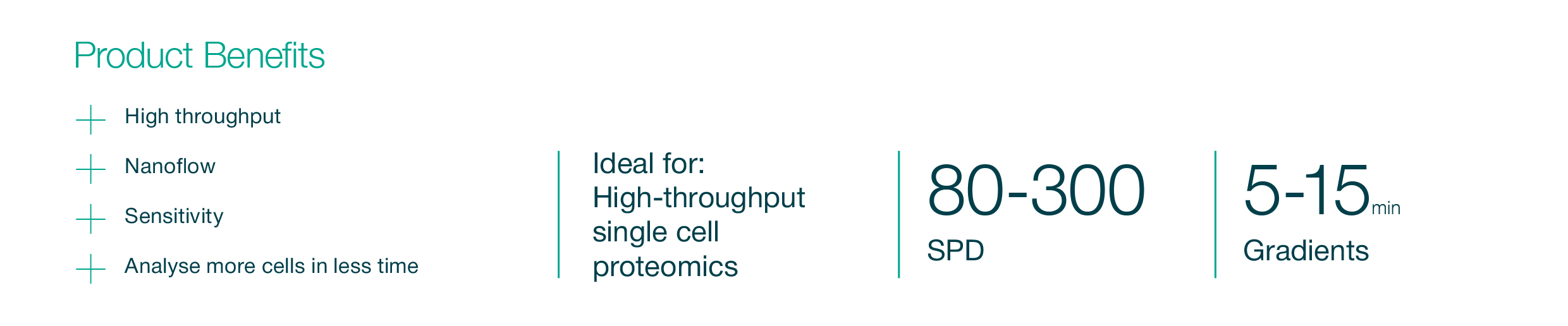 RAPID150はシングルセルプロテオミクスなど超微量サンプルでナノフローによるハイスループット分析を可能にします。短いグラジエントを使用し非常に高い感度を実現。