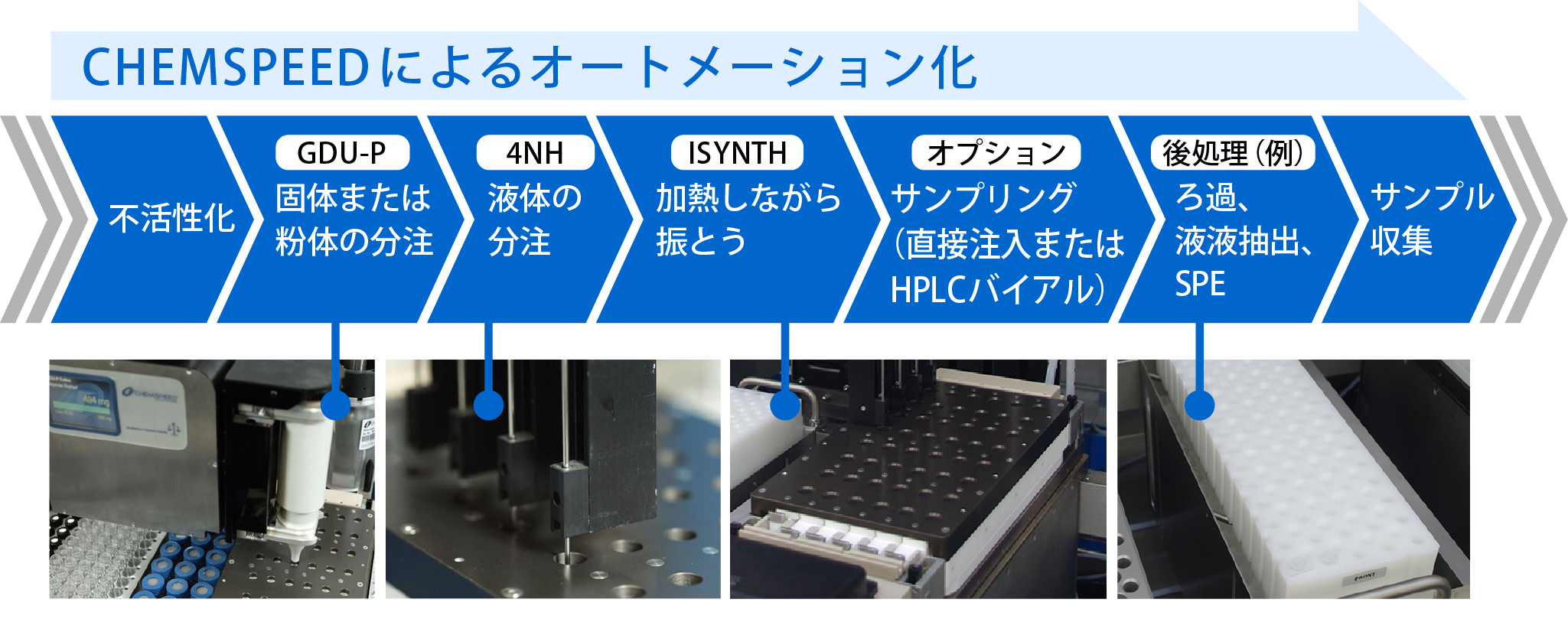 ・液体、固体、粉体サンプルの調製、多段階合成、後処理、精製、分析、およびサンプルの保管場所への移動などの操作が可能